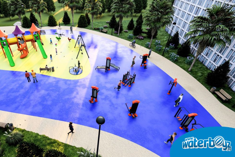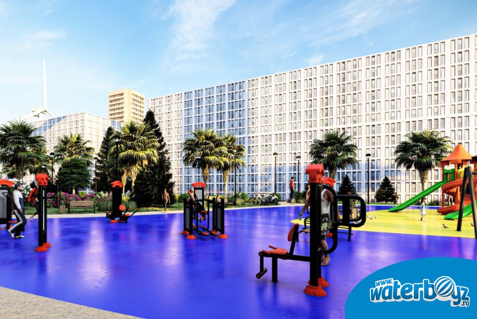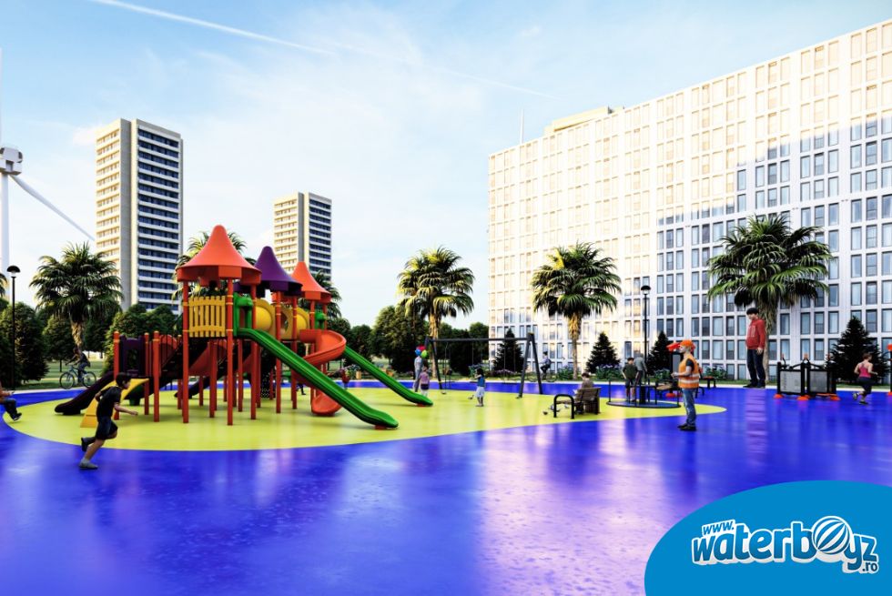 Locul de joacă de exterior dispune de un complex cu trei turnuri și tobogane diverse, concepute pentru alunecări energice și joacă dinamică. În plus, locul de joacă este dotat și cu leagăne, balansoare, carusele și panouri educative interactive, oferind un spațiu sigur și atractiv pentru copii. Această amenajare creează un mediu prietenos, ideal pentru mișcare, joacă și socializare.