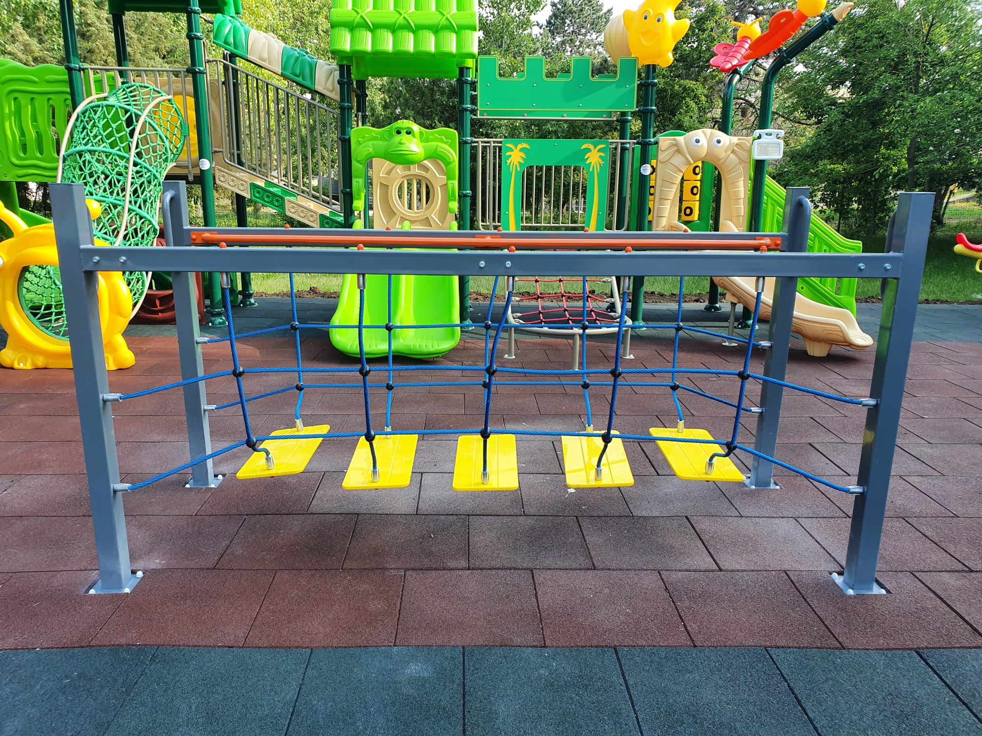 Complexul de joacă este dotat cu două leagăne duble, două balansoare (pe lângă mânerele pentru mâini vine în completare cu un suport pentru picioare pentru o mai mare siguranță), sistem de cățărare tip palmier, sistem de cățărare tip pod, balansoar pe arc pisica, balansoar pe arc delfin.