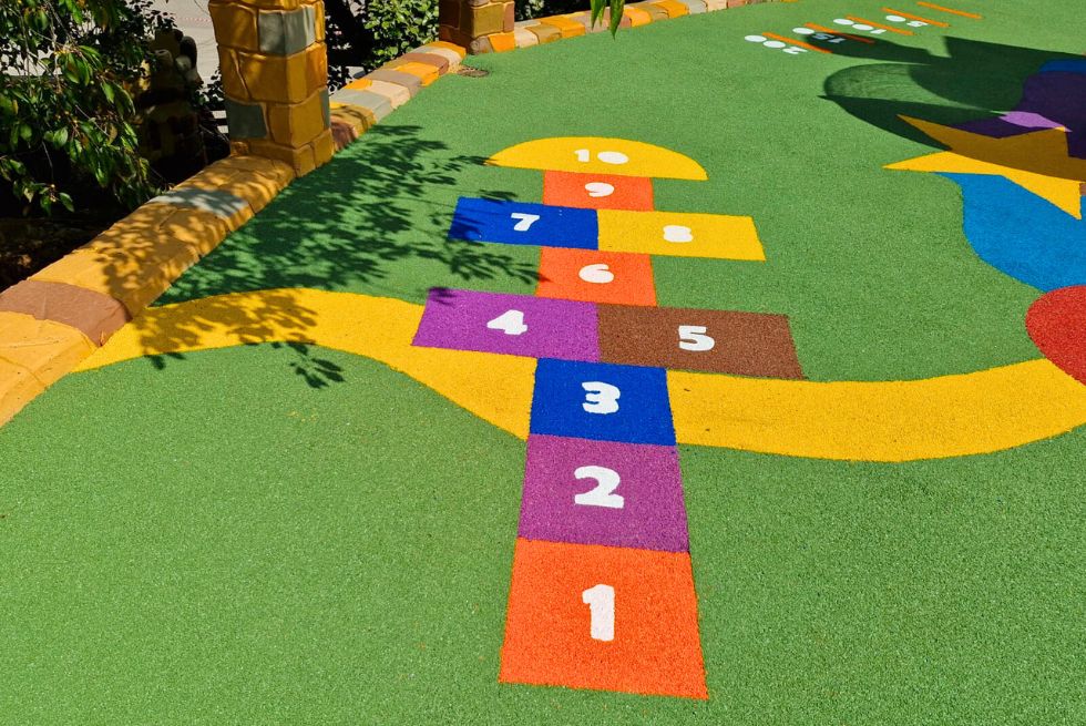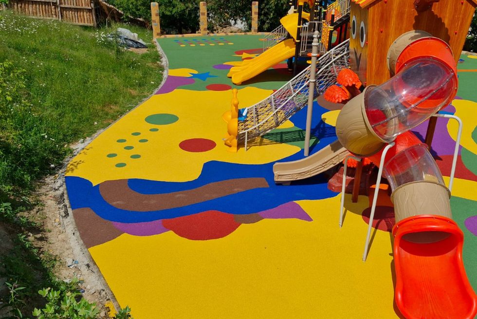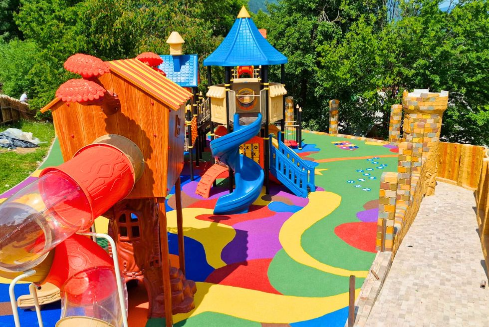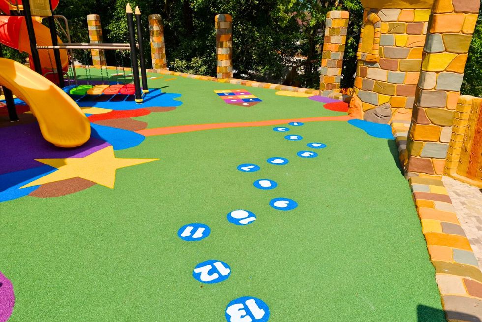 Întregul loc de joacă este amenajat pe o suprafață acoperită cu tartan turnat colorat. Acest tip de paviment este utilizat pentru spațiile destinate copiilor, și nu numai, datorită specificațiilor și beneficiilor sale, precum: