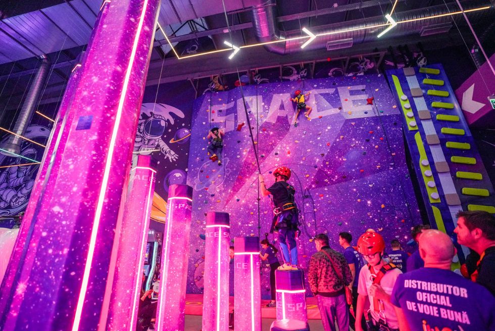 Un alt element spectaculos este Peretele Interactiv, un joc care combină săritul cu reflexele. Suprafețele verticale proiectează lumini care apar aleatoriu, iar tu trebuie să le lovești cu mâna sau piciorul în timp ce sari pe trambulinele dedesubt. Fiecare atingere corectă contează într-un scor afișat live, provocând utilizatorii să-și depășească performanța anterioară. Este un joc rapid și dinamic, perfect pentru toate categoriile de vârstă.