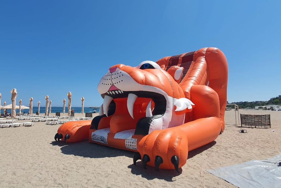 Clienții noștri îl folosesc cu succes la târguri, evenimente private, aniversări, zilele localităților, etc.Piesa de rezistență a echipamentului o reprezintă zona de finish, unde copiii trec prin gura tigrului, care pare că îi prinde între ghearele sale.